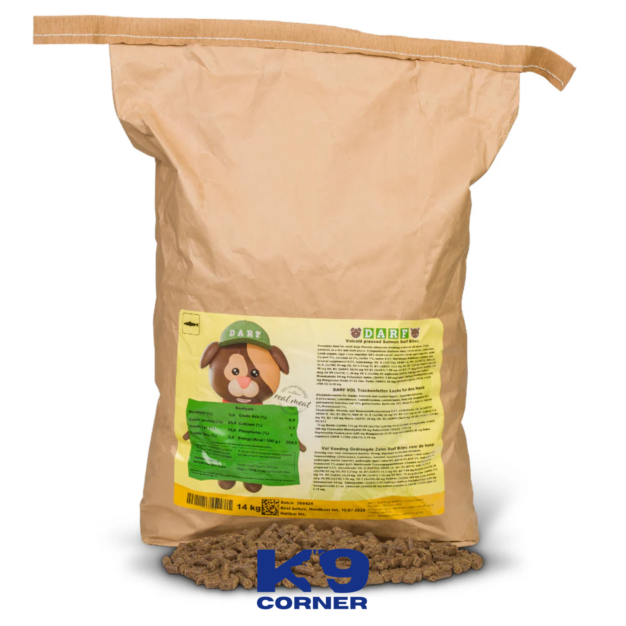 Ingredients: 57% meat and fish (24% salmon edge, 18% lamb, 9% lamb bone, 6% lamb organs), 3% eggs, 15% raw dried carrot, 14% raw dried apple, 5% millet, 2% krill, 2% coconut oil, 1% nettle "Millet is a grain that is relatively easy for dogs to digest and is rich in B vitamins, iron and potassium. Millet is also gluten free and so makes a useful carbohydrate choice for hypoallergenic diets." - allaboutdogfood.co.ukAdditives: Nutritional Additives: Vitamin and Mineral Supplement 0.5%, Moisture 0.5% containing: Vitamin A (3a672a): 18,000 I.U, Vitamin D3 (3a671): 1,800 I.U, Vitamin E (3a700): 60 mg, Vitamin K2: 1.37 mg, Vitamin B1 (3a821): 13.2 mg, Vitamin B2: 7.68 mg, Niacin (3a314): 30 mg, Vitamin B5 (3a841): 24.34 mg, Vitamin B6 (3a831): 7.20 mg, Vitamin B12: 72 mcg, Biotin (3a880): 312 mcg, Vitamin B9 (3a316): 1.20 mg, Vitamin C (3a300): 60 mgBetaine (3a925): 300 mg, Iron Sulfate Monohydrate: 84 mg, Potassium Iodide (3b201), Copper Sulfate Pentahydrate: 4.80 mg, Manganese Oxide: 57.60 mg, Zinc Oxide (3b603): 90 mg, Selenium Organic CNCM l-3399 (3b812): 0.18 mgAnalytical Constituents: Moisture4%Crude Protein25%Crude Fat10%Crude Fibre2.4%Crude Ash5.9%Calcium1.3%Phosphorus0.75%Dietary advice: Gluten-freeEnergy per 100g: 394.5 kcal